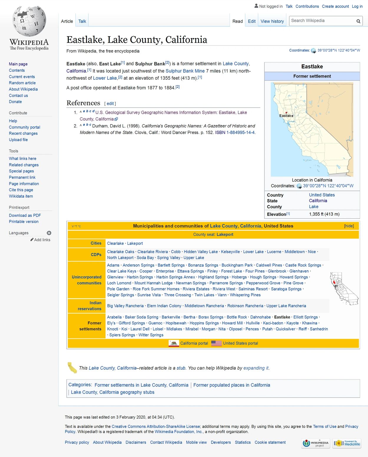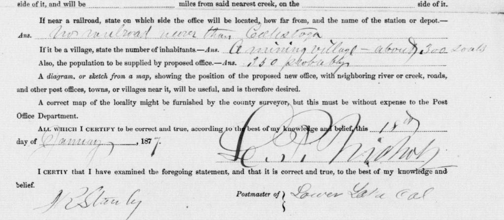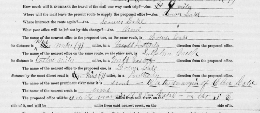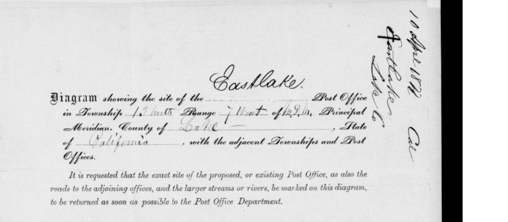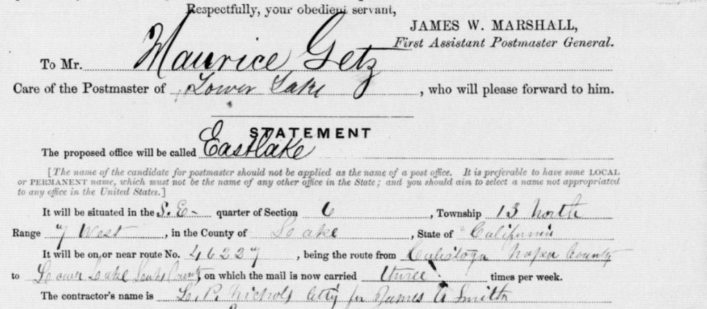 A Post Office was established in East Lake in the year 1877. This is the official record of the Post Office location, split in to sections for better viewing. Image 190 and 191 of microcopy 1126 roll 53 found here : https://catalog.archives.gov/id/68227547